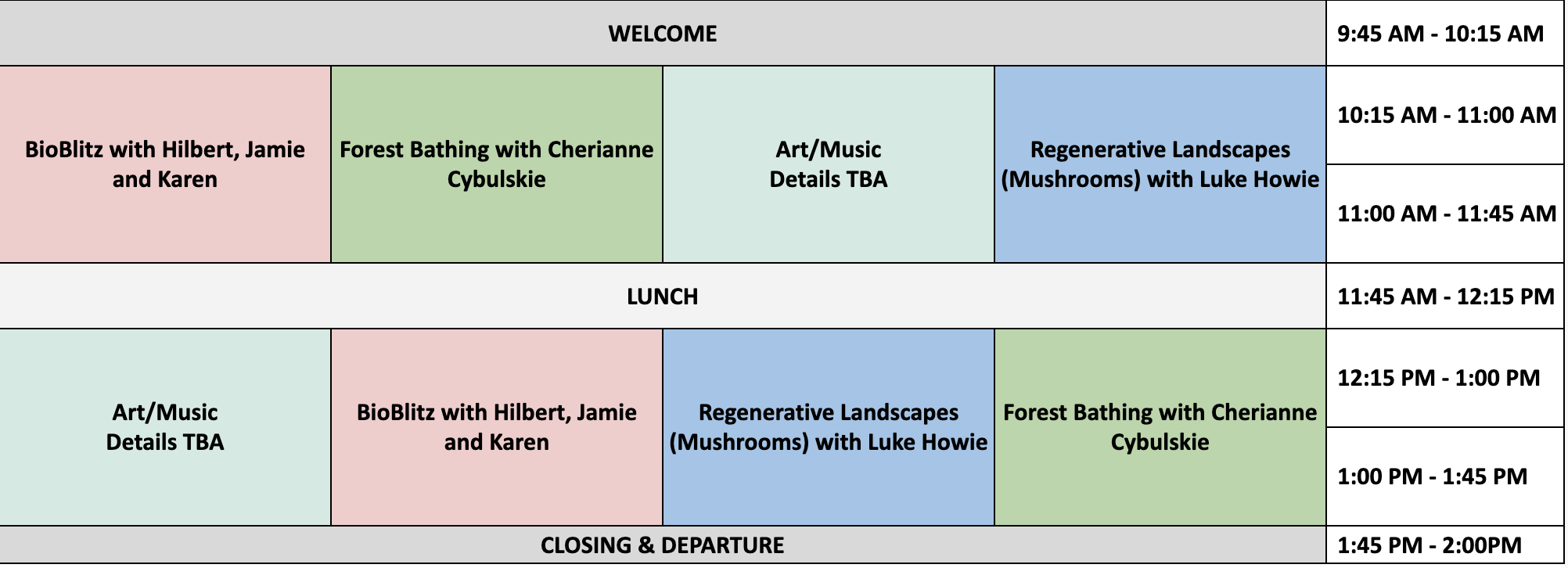 Join us for a family-friendly event on Saturday, May 23, 2026. The day will be packed with workshops on topics ranging from species identification to forest bathing to inocculating logs with mushroom spores! Below is a tentative schedule — subject to change!